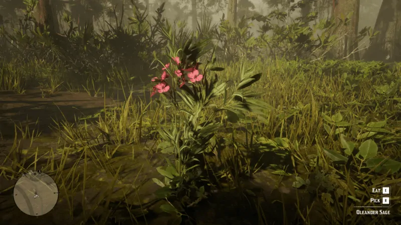 The Oleander Sage is only found virtually Saint Denis, in Lemoyne. The place where information technology's easier to find are the river banks of Bayou Nwa. This herb, which is used to arts and crafts Toxicant weapons like the Poison Throwing Pocketknife and the Poison Arrow, can be spotted from distant cheers to its pinkish flowers.